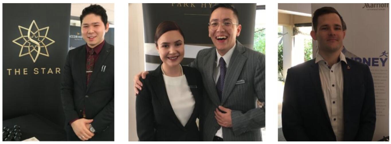 (从左至右)Murat Karaca(2019年毕业),悉尼明星娱乐集团The Star Entertainment Group酒店领导力毕业生;Elise Hofman(2019年毕业);悉尼柏悦酒店人力资源助理;Michael Pham Truong(2019年),悉尼柏悦酒店企业领导力管培生;Julian Loscher(2020年),万豪集团销售