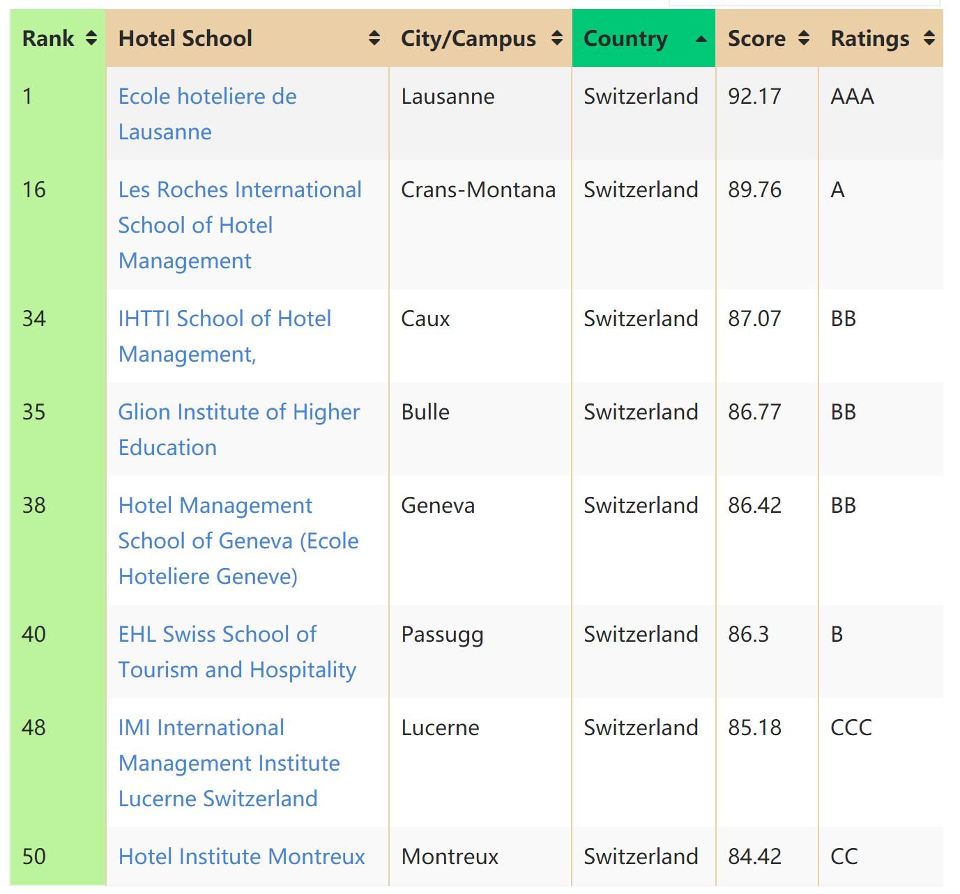 两个排名当中,洛桑酒店管理学院,格里昂酒店管理学院,以及理诺士酒店管理学院都排在瑞士前4,可见这三所院校是普遍认为最好的三所瑞士酒店管理院校。