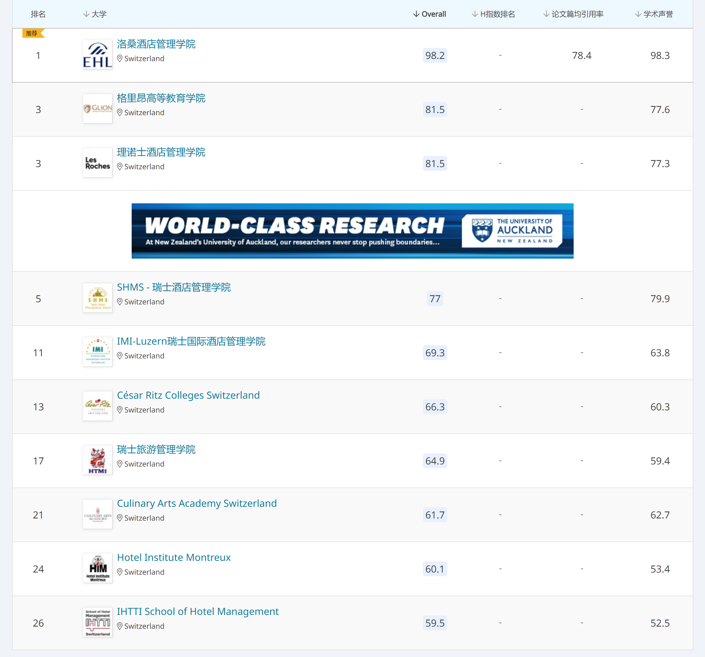 传统的三大大学排名当中,目前只有QS有单独的酒店管理学科排名,所以很多人了解瑞士酒店管理院校的时候都会参考QS排名。