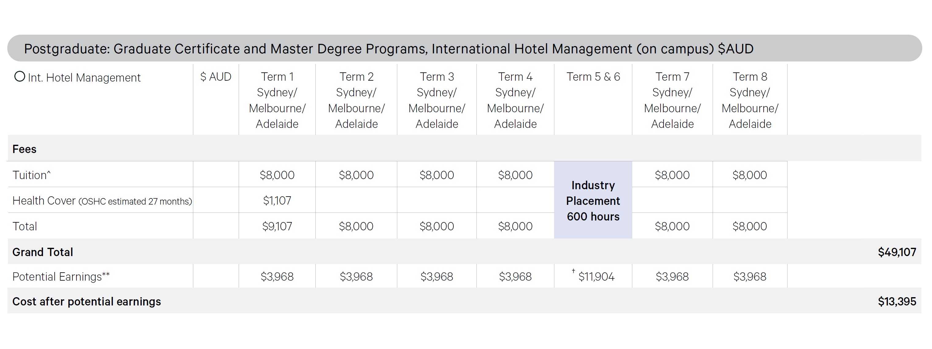 蓝山的研究生可以选择在悉尼校区、墨尔本校区或者阿德莱德校区就读。三个都是走读校区,食宿需要自理。如上图所示,蓝山研究生阶段的学费和保险费共49,107澳元。