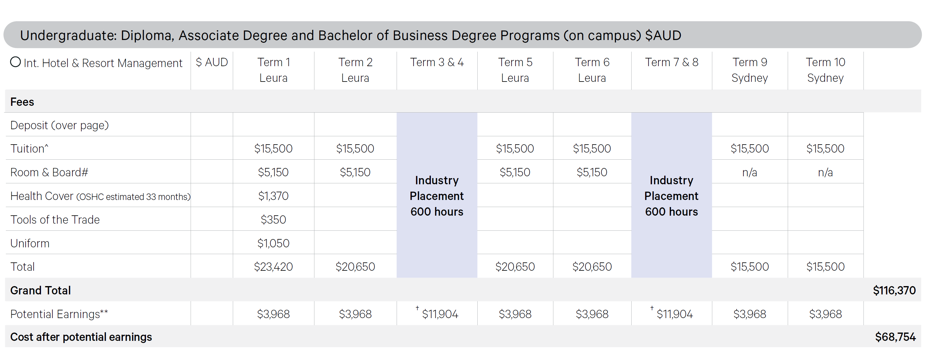 蓝山国际酒店管理学院本科阶段头两年在卢拉校区,学校提供宿舍或伙食;第三年在悉尼校区,食宿自理。头两年的总花费+第三年的学费为116,370澳元(详情如上表所示)。