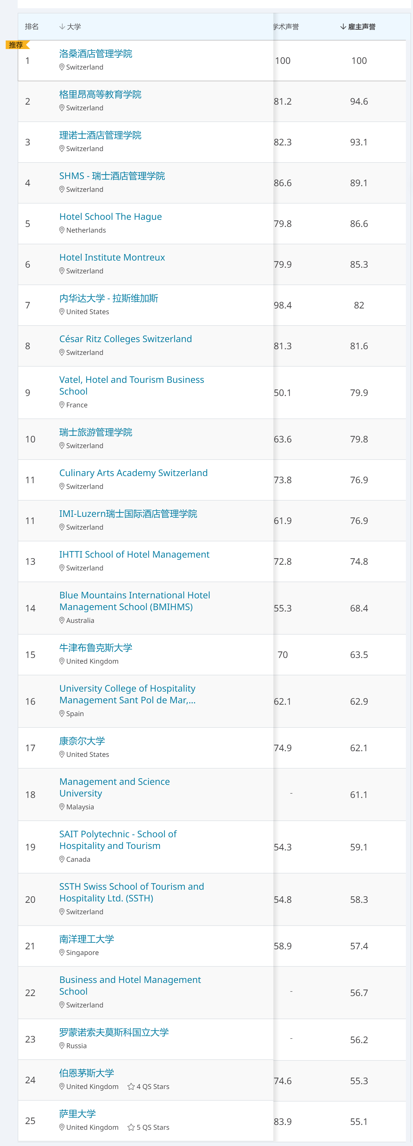 洛桑酒店管理学院,格里昂酒店管理学院,理诺士酒店管理学院,SHMS瑞士酒店管理学院这四所学院包揽全球前四;HIM蒙特勒工商酒店管理学院,恺撒里兹酒店管理学院,BHMS工商酒店管理学院等深受留学生欢迎的院校也相继上榜。