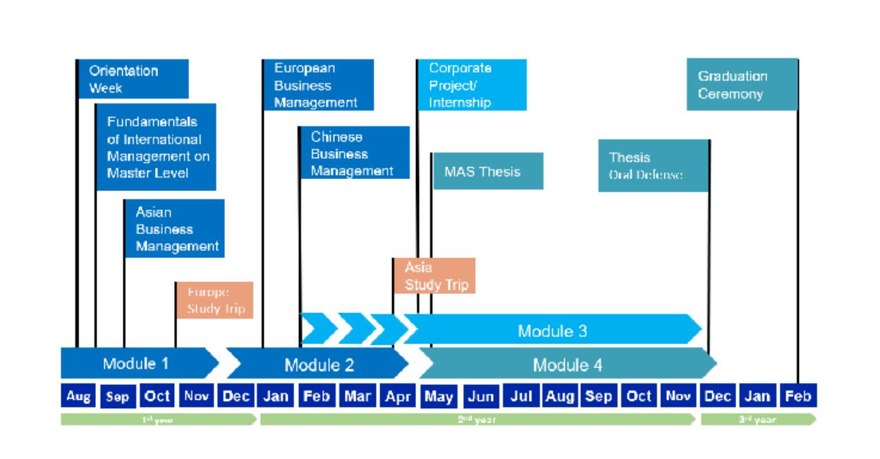 课程模块:国际商业管理概论、欧洲商业管理、中国商业管理、企业项目、硕士论文(课程详情本文第三部分)