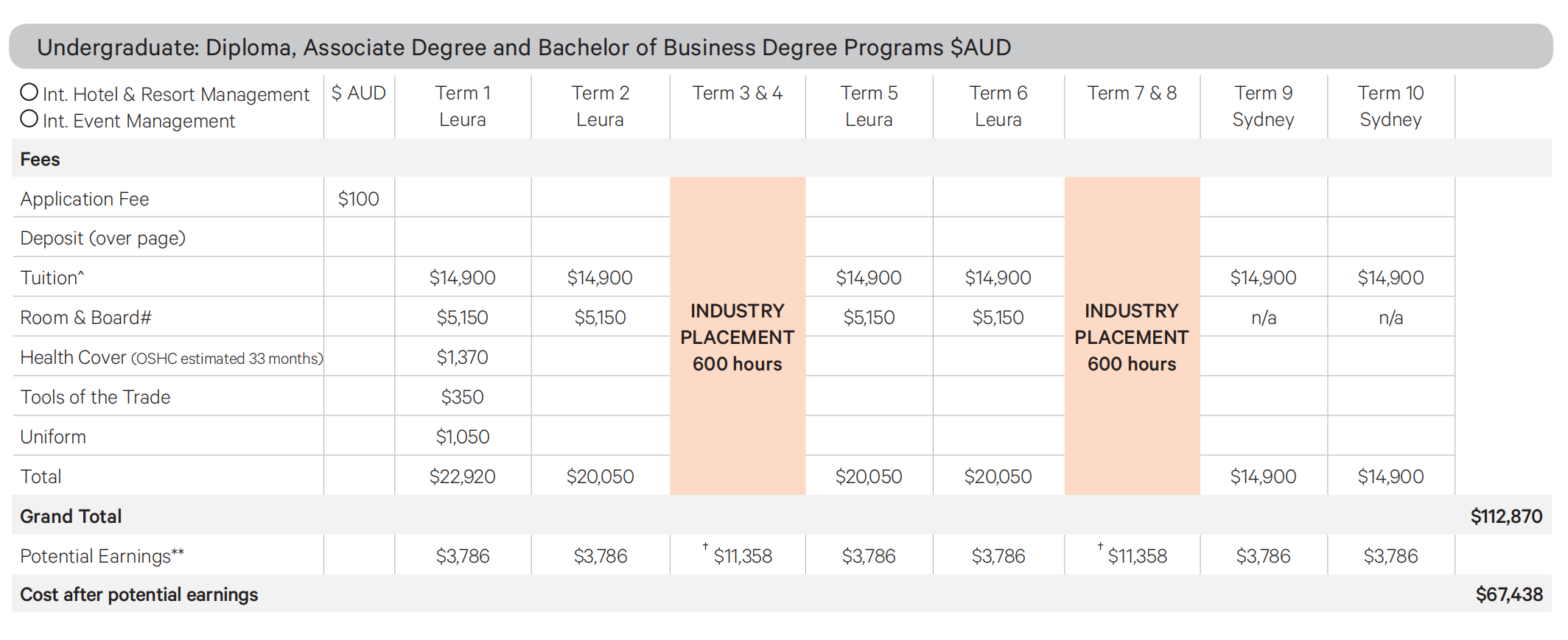 蓝山国际酒店管理学院本科阶段头两年在卢拉校区,学校提供宿舍或伙食;第三年在悉尼校区,食宿自理。头两年的总花费+第三年的学费为112,770澳元(详情如上图所示)。