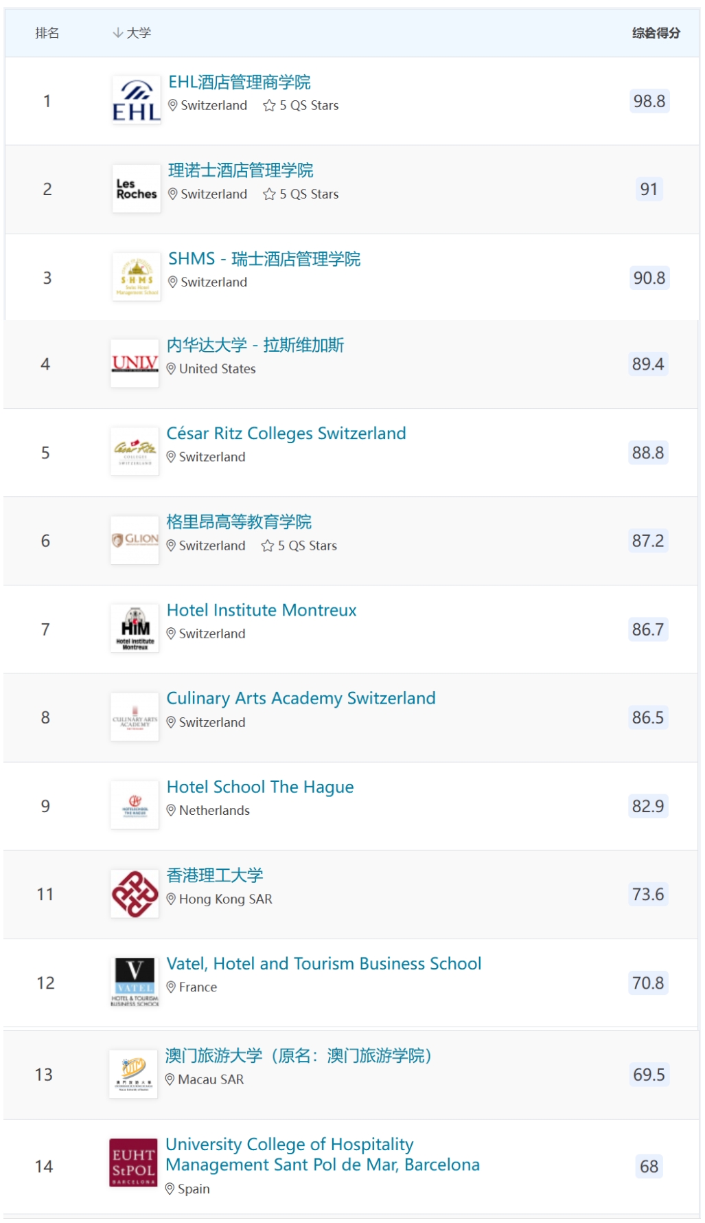2025年毫无悬念,瑞士院校再次“屠榜”,前三都是大家的熟悉的老牌瑞士院校,而前十名中瑞士院校占了7席,可见瑞士的酒店管理教育是真的王牌。