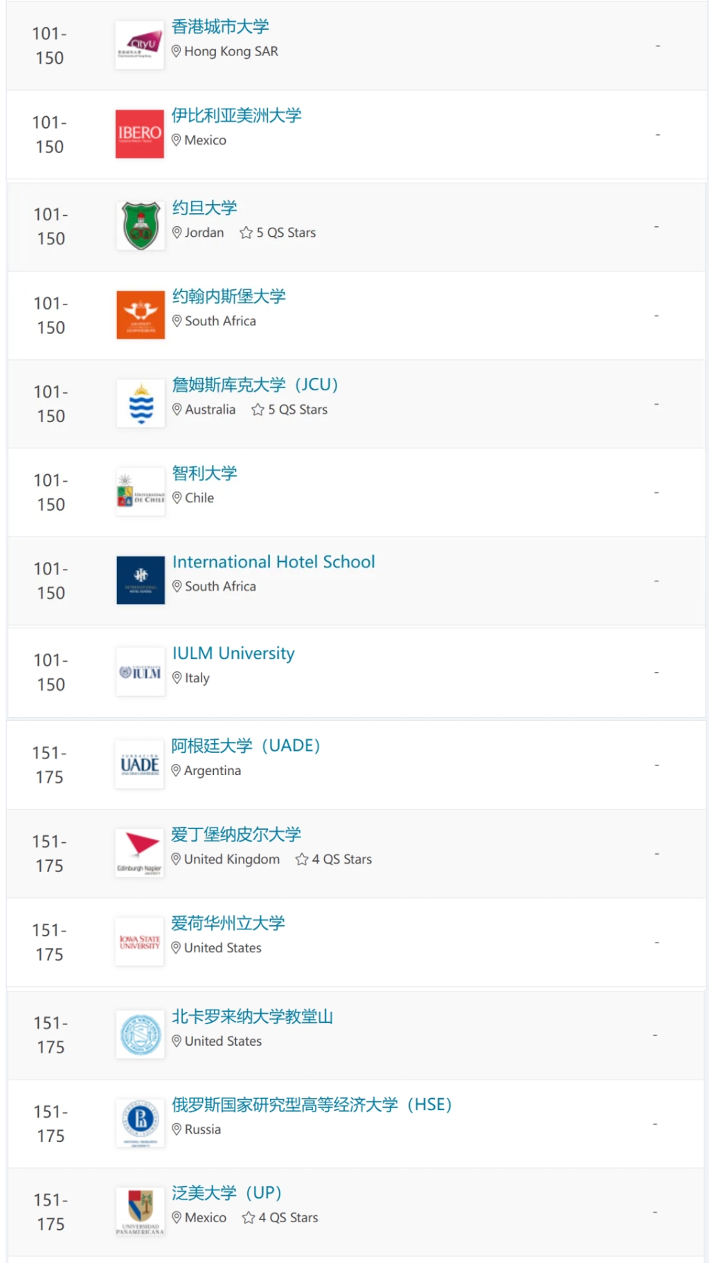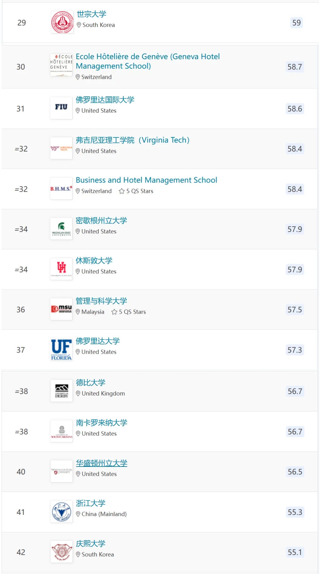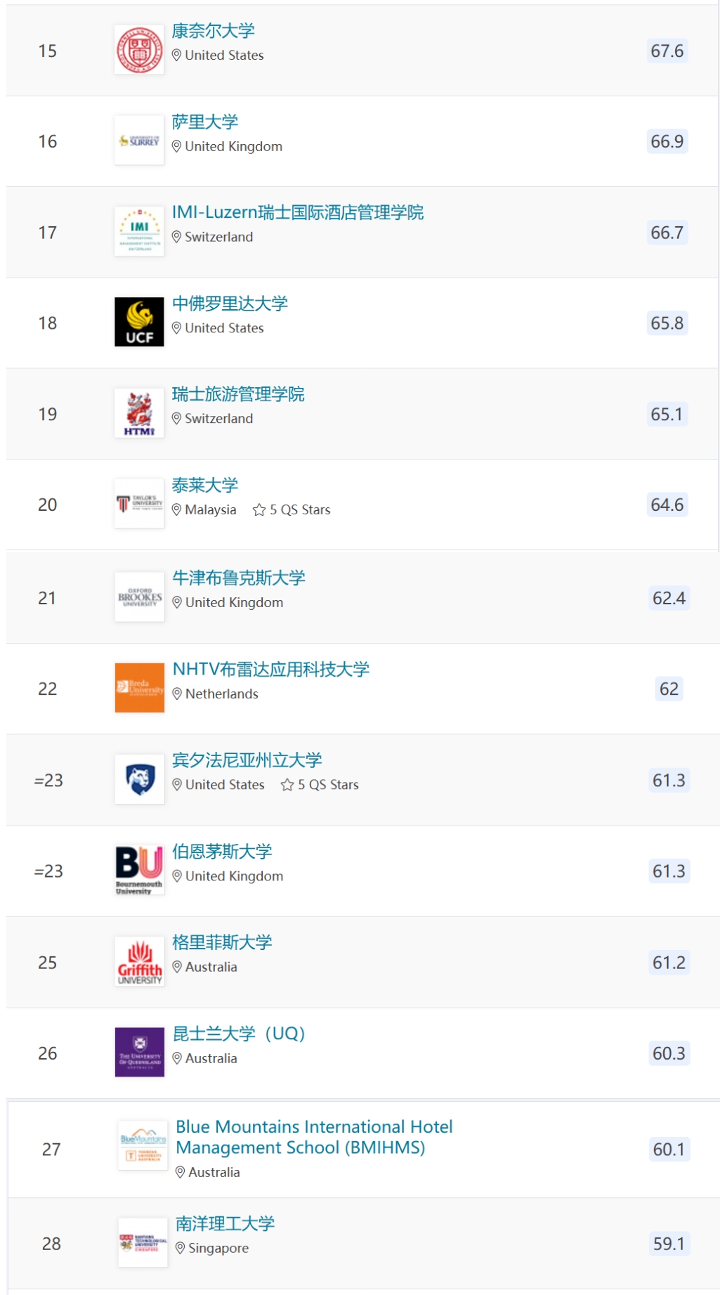 2. 这个排名只列出了全球TOP 175,全球有酒店管理类专业的院校成千上万,所以并不代表没在TOP 175的学校就不好。有些实力较强的酒店管理院院校因为规模太小或其他原因压根就没被比较,当然也不可能出现在此次排名当中